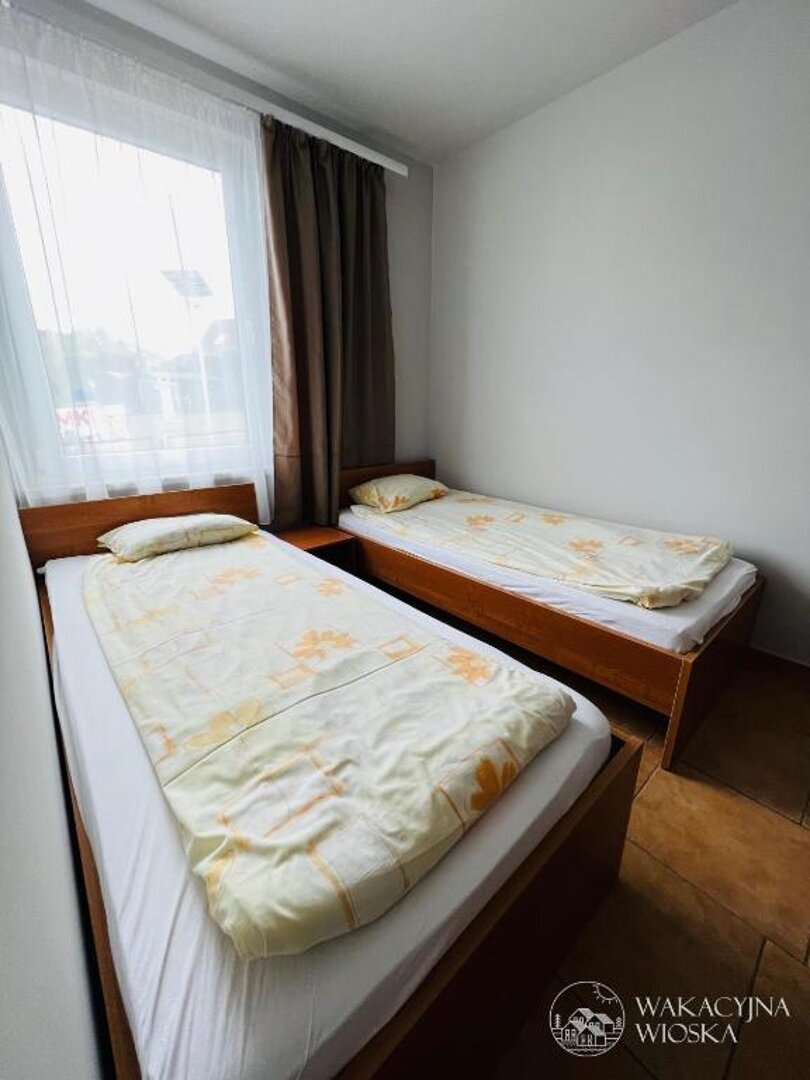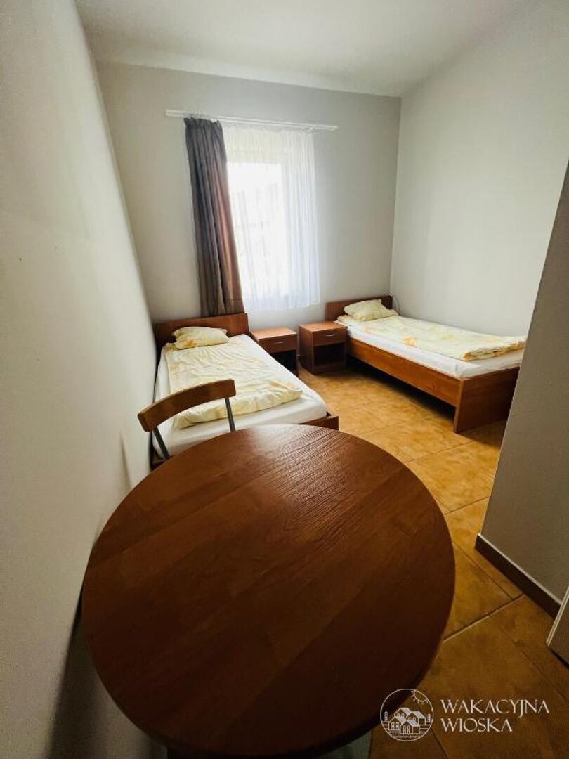 Wyposażenie: Łóżko małżeńskie 160×200 lub dwa łóżka pojedyncze, szafka nocna, szafa, stół, krzesła, TV.
